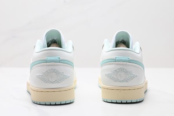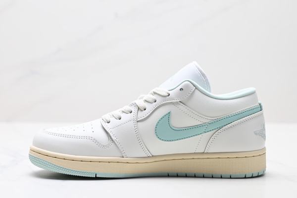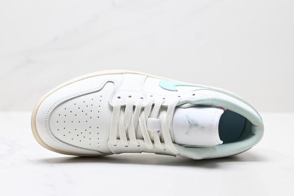 The Air Jordan 1 Low White Green features several thoughtful design elements. The toe box incorporates a perforated pattern, enhancing both breathability and athletic flair. The white laces seamlessly integrate with the shoe’s color scheme, ensuring a cohesive and unified appearance. The brand logo on the tongue is prominently displayed, reinforcing brand recognition. The classic wing logo on the upper and the brand name on the heel are executed in a clean, impactful manner, further solidifying the shoe’s iconic status.