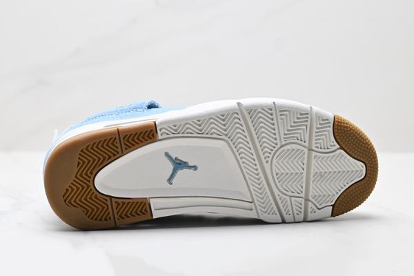 Aged stitching and distressed textures further emphasize the shoe’s rugged, vintage aesthetic. The addition of gold eyelet detailing serves as a subtle yet elegant touch, merging retro styling with a hint of luxury. The Air Jordan 4 is complemented by a clean, white midsole, maintaining the shoe’s athletic heritage while offering a fresh, contemporary look. The primary color scheme of “sail white/worn blue/metallic gold” is both versatile and easy to style.