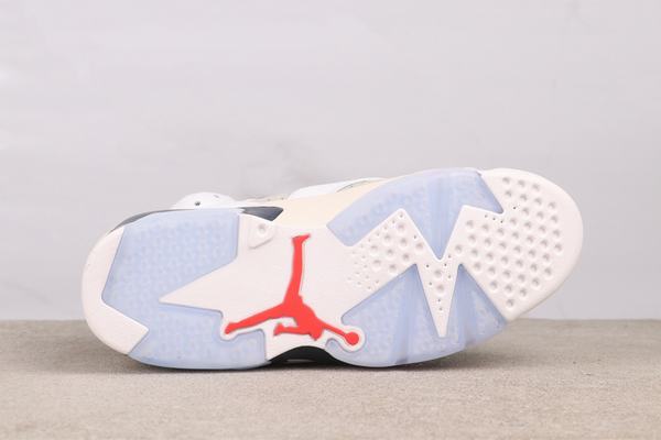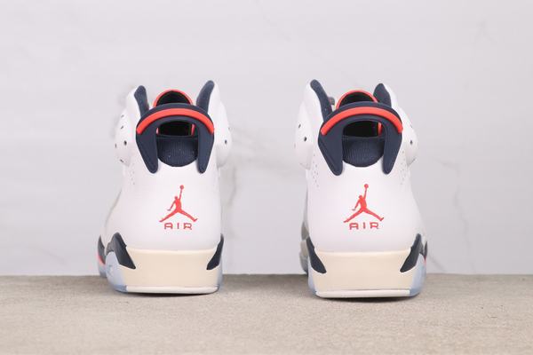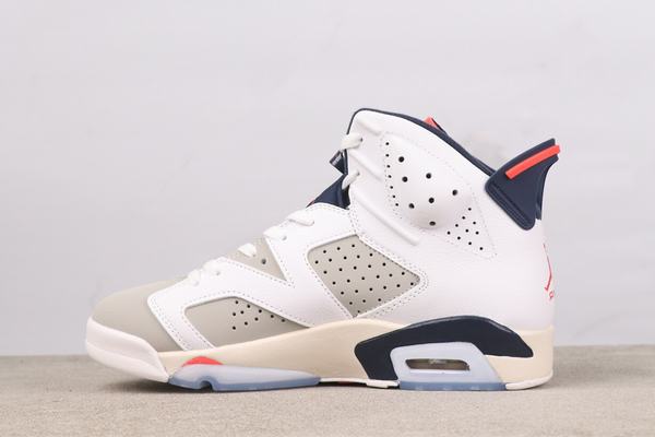 The upper of the Air Jordan 6 Retro Tinker shoe is mainly made of high-quality white leather material. It has a fine texture and is durable, setting a classic tone for the shoe. The deep blue accents on the tongue, lining and upper of the shoe add a sense of layering and visual contrast, making the overall look more diverse. The red details on the side of the shoe play a role in adding the finishing touch, infusing the shoe with a touch of vitality and making it classic yet fashionable. The unique design at the lacing holes and the small labels on the LACES demonstrate quality and dedication in the details.