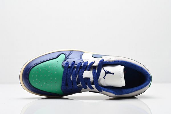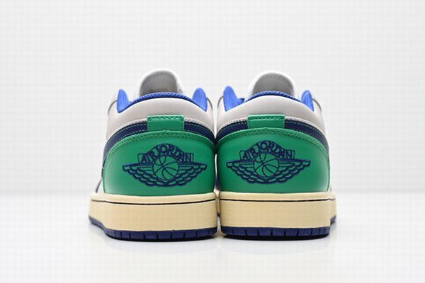 From a performance standpoint, the Air Jordan 1 Low White Blue Green delivers a comfortable wearing experience. The midsole is engineered with moderate cushioning, offering sufficient impact absorption for daily wear and helping to minimize foot fatigue. The leather upper is not only visually appealing but also provides a degree of structural support, ensuring a secure and stable fit for the foot. This allows the wearer to feel comfortable and confident during walking or light physical activity.