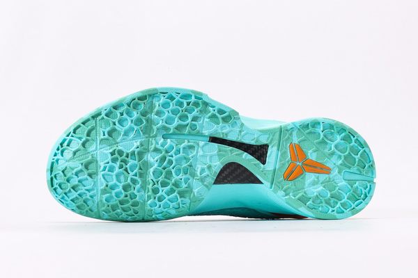The upper of the Kobe 6 Protro Green Copper is primarily finished in a bright and fresh aquatic green, delivering a vibrant and energetic look. It features a unique “snake scale” texture that not only enhances visual drama but also cleverly echoes Kobe’s “Black Mamba” persona, symbolizing his swift and aggressive style of play.