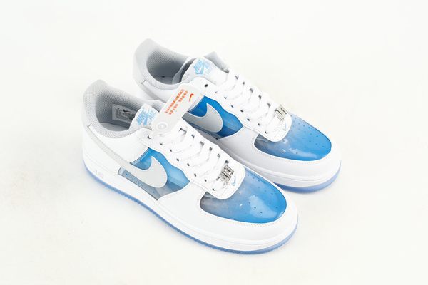 Some parts of the upper area of the shoe are made of transparent or semi-transparent blue material, as if it were a clear lake water, adding a sense of vitality and freshness to the originally simple white upper, making the shoes more visually layered. The iconic Swoosh logo is presented in silver, complementing the white and blue colors. This not only highlights the brand's identity but also adds a touch of fashion and technology to the overall look, adding a unique charm to the fresh atmosphere.