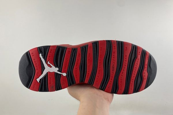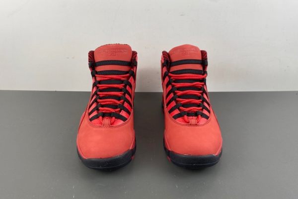 The lines that encircle the side of the shoe, recording the glorious moments of Jordan's career, have become the iconic symbol of the Air Jordan 10 and stand out particularly against the backdrop of red. The lacing system is uniquely designed. The black LACES contrast sharply with the red upper. It is not only sturdy and durable, but also fits the feet closely to ensure comfort and stability when wearing. Moreover, the color combination enhances the layering of the shoes. The Jumpman logo on the tongue and heel of the shoe is exquisitely crafted, subtly yet clearly highlighting the identity of the Jordan brand.