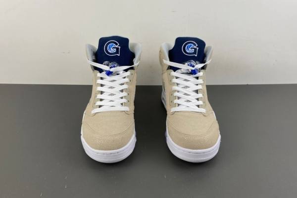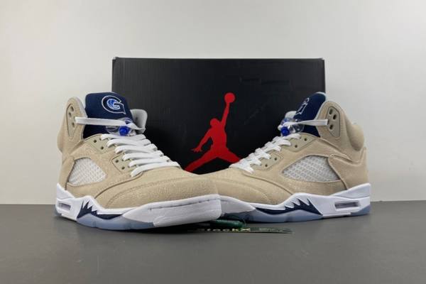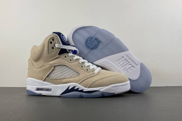 This pair uses soft beige as its main color. The upper is made of high-quality deerskin, with a delicate touch and natural texture. It seems to perfectly merge deerskin’s wildness and elegance, adding a touch of luxurious retro charm to the shoe. The beige upper is matched with cheap jordans online deep blue details (including the tongue, upper decorations and midsole shark tooth shape), creating a classic color contrast. It not only retains the Air Jordan 5’s signature outline but also grants the shoe unique fashion recognition through material and color innovation. The tongue’s brand logo and upper’s blue decorative details clearly show the brand identity and serve as visual highlights.