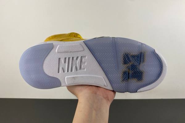 The deerskin suede upper of the Air Jordan 5 Deerskin Burst Yellow not only offers excellent texture but also has good breathability and comfort. The midsole is made of white EVA material and is equipped with a visible Air cushion unit inside, providing outstanding shock absorption performance while showcasing a sense of technology through a transparent window. The outsole is made of light blue transparent rubber, with a deep texture design on the surface to enhance grip and ensure stability during movement.