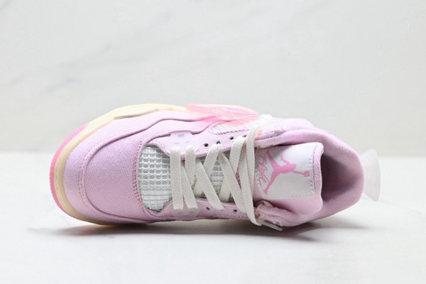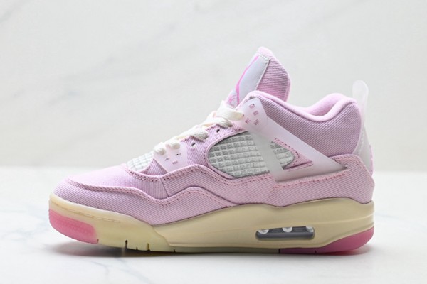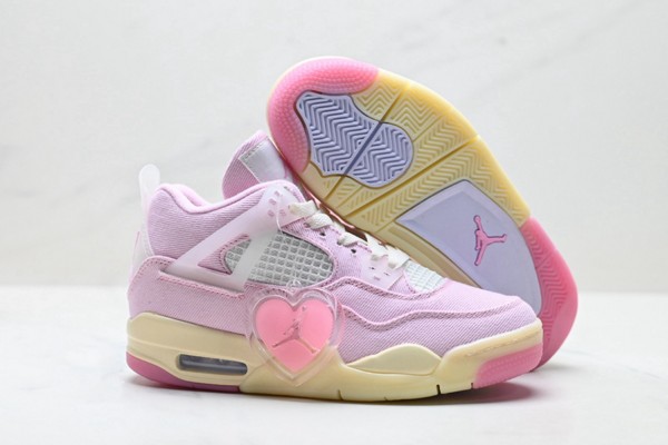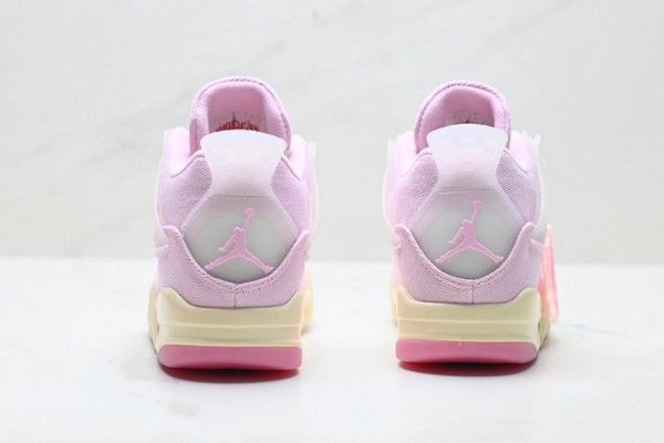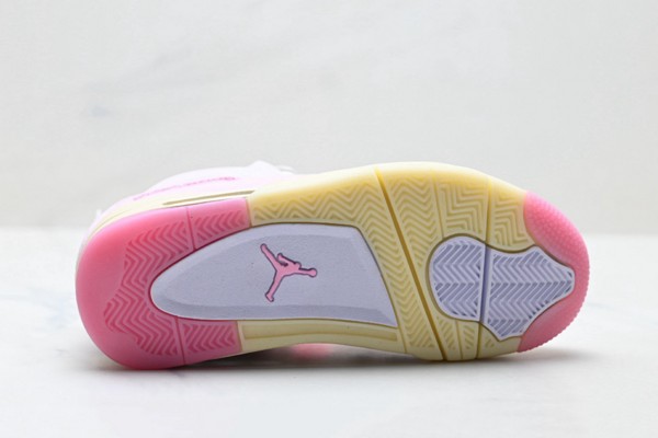This shoe is based on the classic mid-top contour of Air Jordan 4, retaining the iconic heel curve and layering of the shoe body. The upper is made of high-quality leather: pink leather covers the heel, both sides of the shoe body, and the back of the shoe, with a delicate texture like silk dyed by cherry blossoms, bringing a gentle and sophisticated feeling. The Swoosh logo on the side is presented in a smooth arc, retaining the classic genes while injecting a touch of vitality into the whole. The "Carmine Red" is embossed on the pink leather at the heel, highlighting the unique identity of the shoe model.