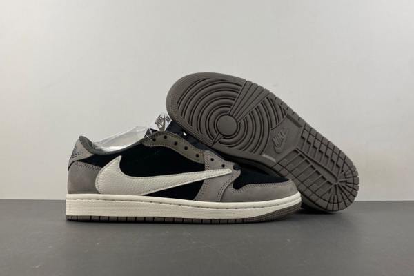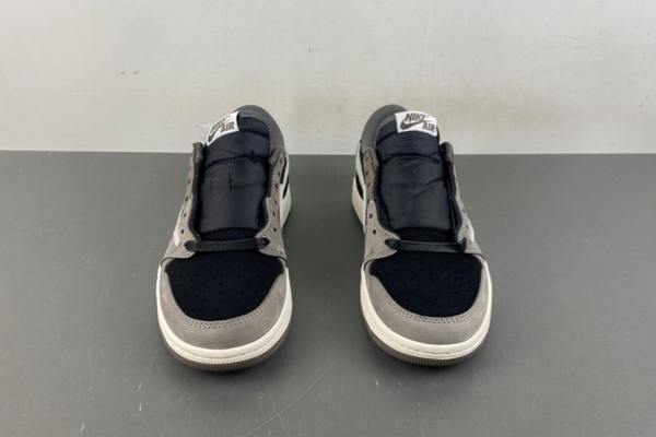 Travis Scott x Air Jordan 1 Black Grey White covers the main body of the upper with a combination of dark grey suede, black mesh fabric, and off-white leather. The granular texture of the suede, the breathable feel of the mesh, and the fine luster of the leather create a triple material contrast. It not only continues the classic low-top silhouette of the Air Jordan 1 but also enhances the shoe’s street layering through material mixing and matching. The aged beige Swoosh logo on the upper breaks the regularity of traditional color combinations, exuding a more casual and retro style. Signature details (such as the label on the tongue and the porous design on the upper) maintain the recognition of the Travis Scott collaboration, while the understated color transition on the side of the shoe makes the overall visual both rich and not messy, becoming an emotional anchor point for fashion enthusiasts and sneaker collectors.