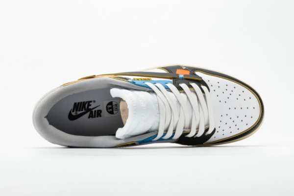 The black reversed Swoosh on the shoe body has handwritten graffiti patterns, the orange woven label at the tongue, and the yellow warning label on the upper, continuing the iconic industrial visual symbols of Off-White; the midsole adopts an aged beige tone, the black "AIR" logo printed on the side is concise and powerful, paired with a translucent icy blue outsole, seamlessly connecting the retro texture with avant-garde design. The exposed lacing holes and exposed sponge tongue on the shoe body, every deconstructed detail showcases the bold re-creation of traditional shoe designs.
